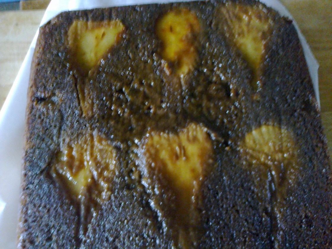 It was a very funny mixture; first of all there was only a very small amount of plain flour (plus baking powder) and a large amount of ground almonds, secondly, although I had followed the recipe precisely and with the correct sized tin, there was hardly enough mixture to cover the halves of pear. I cooked it for the correct amount of time (50-70 minutes – and then I cooked it for an extra 15) but when I turned it out and turned it over, there was an actual puddle of wet, yes wet mixture in the middle, which you may just be able to see in the picture. I put it back in the oven upside down so the pears were on top for another 15 minutes and it was just about cooked – yes I know ginger cake should be gooey – but not runny!