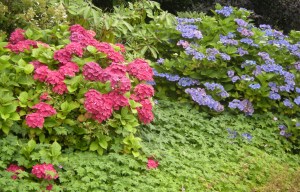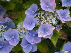 They are native to southern and eastern Asia and the Americas and they are actually quite remarkable plants because of their colour – and how it can be altered and it can change. Actually not all hydrangeas can do this but mopheads and lace-caps can. This change is due to the pH factor of the soil, which apparently affects aluminium availability (I’m not scientific enough to know what this means) but I do understand that blue or pink flowers tend to be blue in acid soil condition, mauve in neutral soil and pink in alkaline conditions. There are also white and green flowers which don’t change whatever the soil conditions. Another reason for colour change is the season – in late summer blue and pink flowers fade and become a mixture of green and pinky red, whereas white flowers can change to a wonderful pink. It’s almost like magic!