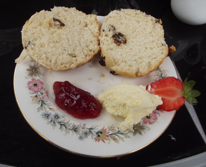 Cut open the scone… now, cream or jam on first?