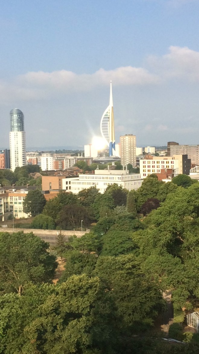 The room was small, especially for a 6’6½” husband and a chunky me; there was an en-suite (quite small but spotless and modern with a good shower) wardrobes and cupboards, a desk, a chair, a ¾ sized bed, blinds, two windows, only one of which opened, and only opened an inch, and a fabulous view looking south across the city and across the Solent to Gosport and beyond. It was a very small room to be honest, but it was modern, clean, comfortable and with stunning views (although facing south during this gorgeous blazing summer did make it rather hot!)