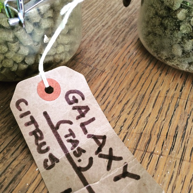 The hops I saw were Galaxy™, which apparently has “strong passion fruit, peach and citrus characters” . We were able to open the jar and sniff, and yes, the peach and passion fruit aroma came bursting out! It was like a little breath of Tasmania had flown out of the bottle like a genie summoning happy memories