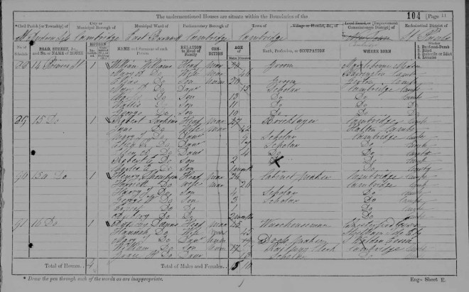 Still no joy so I’ve moved to the 1881 census and both Henry and Harriet have changed their birth date to 1843; I know it’s the same family because of the same names of children, including the unusual Aubrey (the only other Aubrey Thompson in the census was born in India) Harriet again states she was born in Cambridge so I’m pretty sure that must be so. They have moved now to Convent Garden, no not the famous one, this one is in Cambridge in the same parish of St Andrew the Less. Henry is a cabinet-maker; his eldest son, no longer Harry but Henry is a domestic servant, the rest of the children are at school or home. There are more children in the family, a little girl, Amy Harriet born in 1874, baby Charles just a year old, and tiny Barnabas. There has been sadness though, because at around the time Amy was born, little Ernest died aged just five. Another son was born in 1878 and he was named for his brother, Ernest Frank.