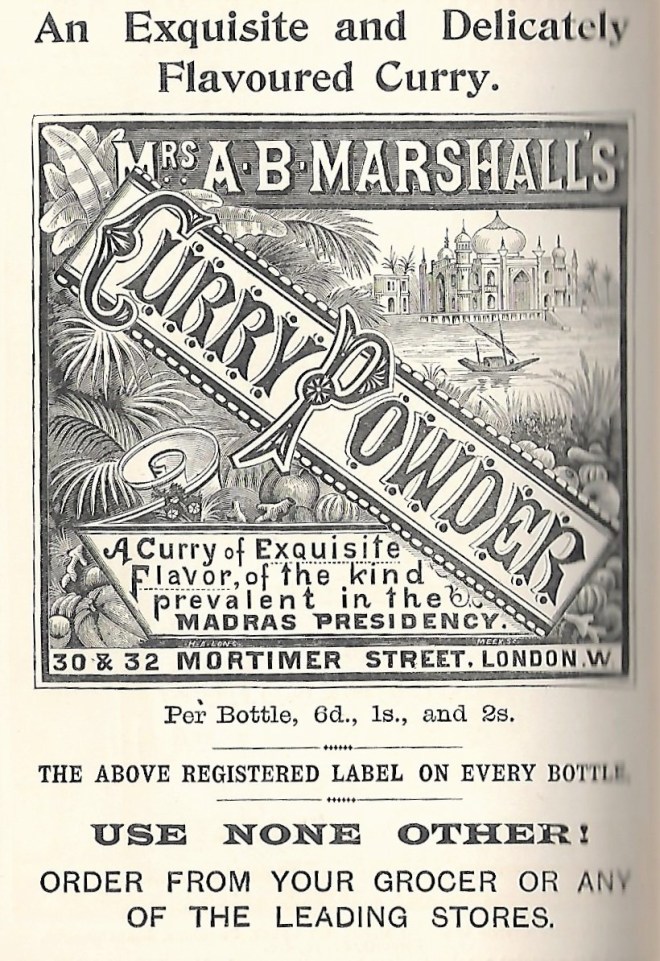 Dipping into Agnes Bertha Marshall’s Cookery Book, and as with most nineteenth century recipe books the back is full of adverts, mostly for Mrs Marshall’s own products and equipment, such as this curry powder. It’s praised not for its heat but its flavor – spelt in a way we now thin of as American English.