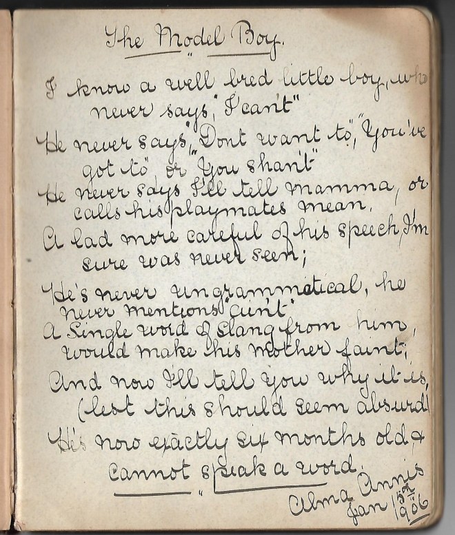 There’s a poem which caught my eye because it is written in large, distinctive handwriting, called ‘The Model Boy’. I eventually traced the authorship to Hannah G. Fernald – I can’t for the moment tell you much more about her except I have found other little verses by her.