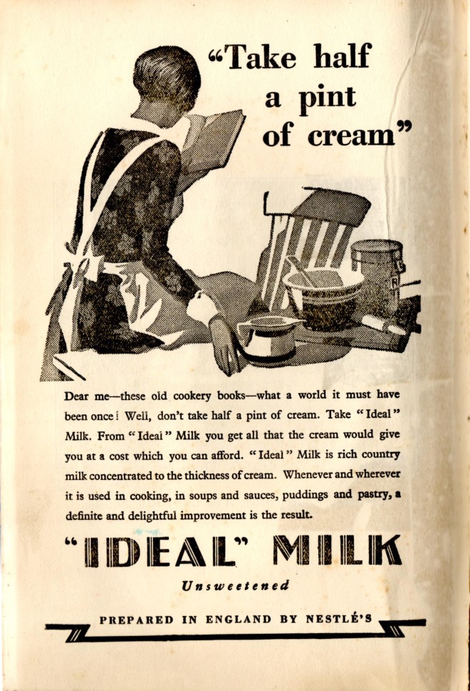 Philip Harben, in his 1946 Cooking Quickly book, has a whole section on tinned, packet and dried foods. Although he appreciates dried milk, he clearly is not a great fan ‘however carefully the mixing process is done the result is hardly ever a perfect liquid, there is usually a slight powderiness about it, and a small amount of sludge.‘ he doesn’t mention dried milk bergs though!