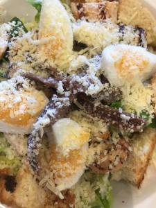 What could be easier than a Caesar salad, as I mentioned before in a previous post. Lettuce, chicken, hard-boiled eggs, anchovies, bread, Parmesan cheese, possibly capers… It was invented, apparently in 1924 by Caesar Cardini, but there must have been a million interpretations of it since then. Last time I wrote I was complaining (not like me!!!) about a fancy and expensive restaurant I had been to and been given; this is what I said:
