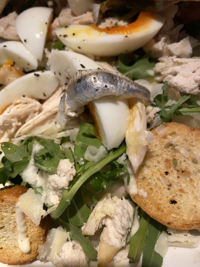 I went to a really posh restaurant in town and asked for Caesar salad and honestly it was a disgrace, soggy big leaves of lettuce, wet chicken in a lump, chunks of parmesan etc, I was quite shocked and yet a chain like Pizza Express does it beautifully!