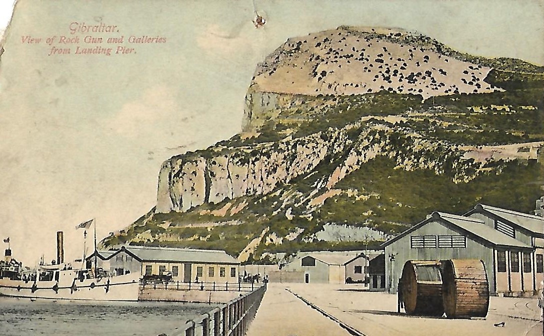 I came across an old postcard with no connection to anyone in our family – I think my mother-in-law collected postcards although this one, I discovered was sent before she was born… but back to the beginning. I found this very old postcard of Gibraltar; I’m not sure if it’s an actual photo or a painting, it’s old and rather faded and an inscription says ‘Gibraltar – view of Rock, Gun and Galleries from Landing Pier.’ I can’t see ‘the gun and can’t find out what it might have been after a cursory Google glance, but wonder if it may have been ‘the impressive 100 Ton Gun installed in the early nineteenth century but never fired in anger’ – I must find out more, but back to the postcard because it is the back not the front which interested me.