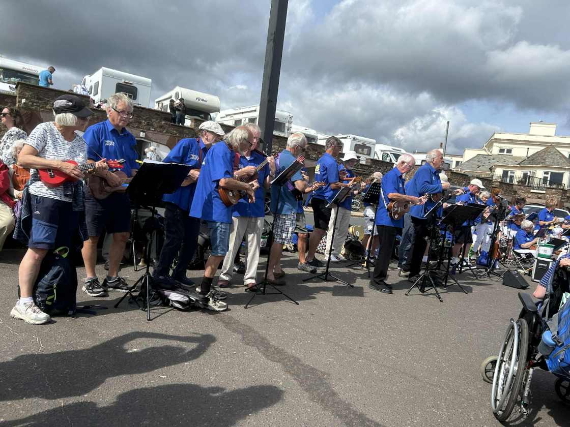 I wrote yesterday about our day out at the Sidmouth Folk Festival, and how successful and what fun it had been for the Weston Ukulele Players, aka WUPs. Sidmouth has a long promenade above the beach, the Esplanade ( or so I believe it’s actually called) and it’s along here that all the ad hoc entertainers turn up, the clog dancers, the country dance dancers, the bagpipers and jugglers, the solo guitars/ accordions/ concertinas/ fiddlers and singers. There were about forty WuPs, and they arranged themselves in a group along by the wall between the prom and the road then set to with singing, accompanied by a couple of guitars, including my husband on bass.